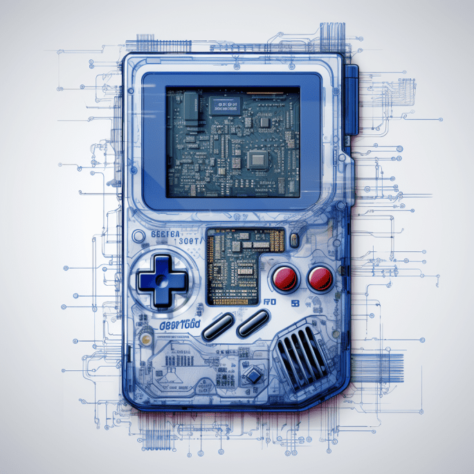Prompt: Blueprint drawing of a Gameboy, in the style of Akihiko Yoshida